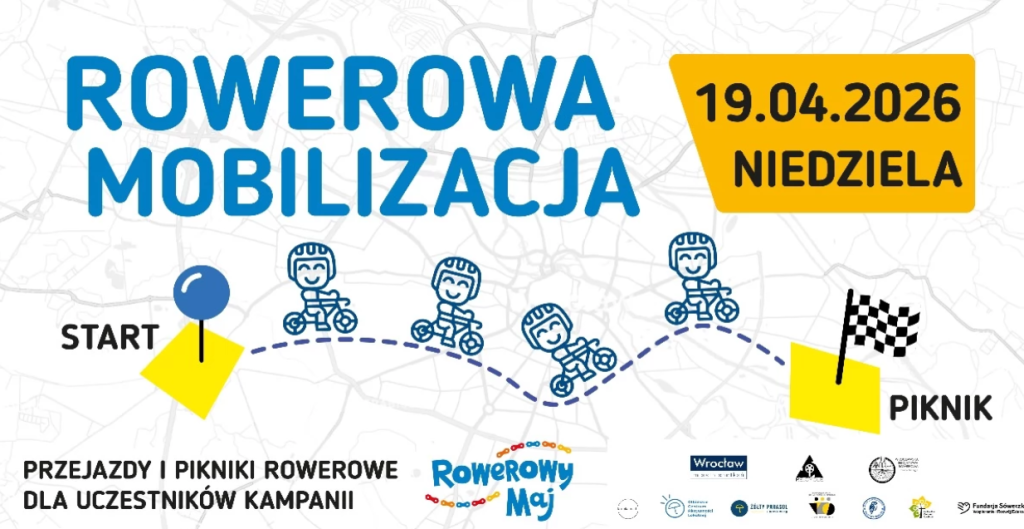 Serdecznie zapraszamy wszystkich uczestników Rowerowego Maja – dzieci i ich rodziców oraz wszystkich Państwa, do wzięcia udziału w „Rowerowej Mobilizacji”, która odbędzie się dnia 19.04.2026 (niedziela), w godzinach 14.00-19.00 w trzech lokalizacjach we Wrocławiu: